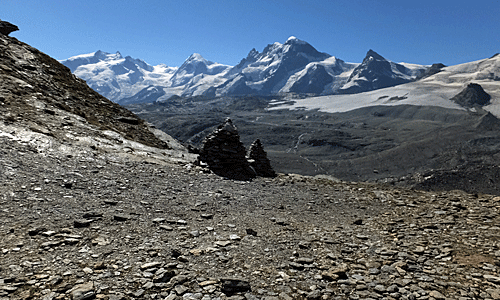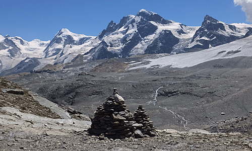 | このケルンから、たらたら歩きになる 13:09 バックの山は、ブライトホルンとクラインマッターホルン |