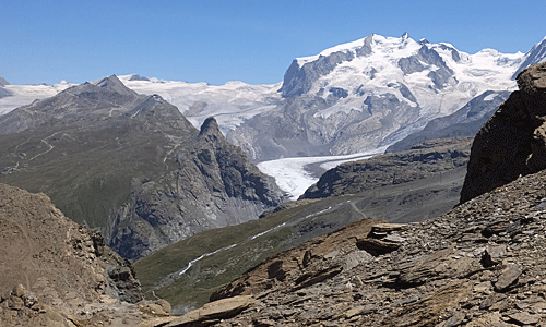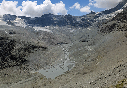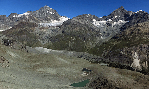 | 白い山と氷河と そこから流れてくる川と氷河湖と・・・ おなじみの山 モンテローザとブライトホルン |
