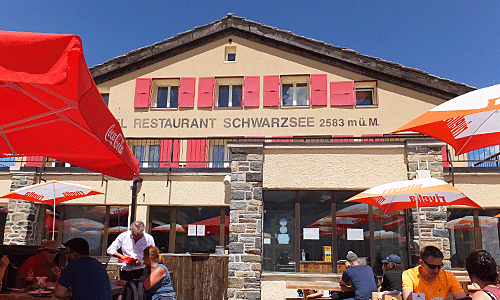 | どんどん下るとゴンドラ駅と、 シュヴァルツゼーのレストラン ここで岩の上に腰を下ろして、ちょっと休憩 |