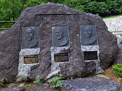 | インフォーメーション玄関前の「南アルプスの開祖の碑」 左は、山梨県知事だった天野久氏 真ん中は、外国人として初めて北岳に登頂したウェストン氏 右は、芦安村長だった名取運一氏 インフォーメーションの玄関で、 計画書をポストイン |