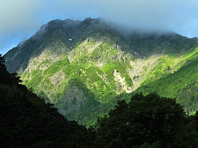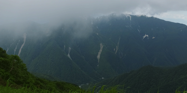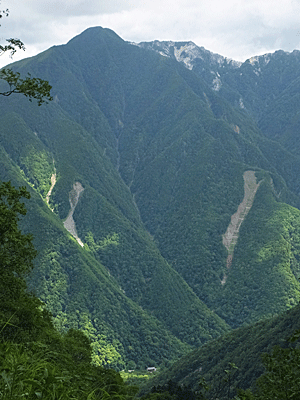 | やっと、右端に薬師ケ岳2780mが見えてきた 左は観音岳 地蔵岳は木に隠れてしまった |