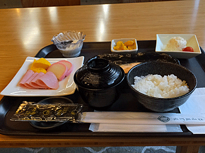| 6:00 朝食 左のハム・かまぼこ・卵焼きは、おなかいっぱいでもう十分 手つかずで返却した 他は、完食 |