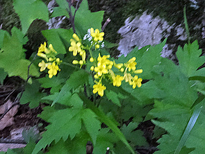 | ハクサンオミナエシ:アブラナ科 暗い樹林の中の花は、少ない 大樺沢コースと比べたら、 それの二十分の一くらいの少なさ |