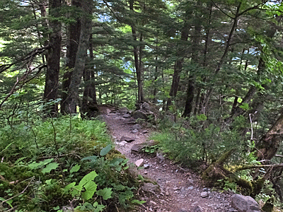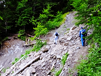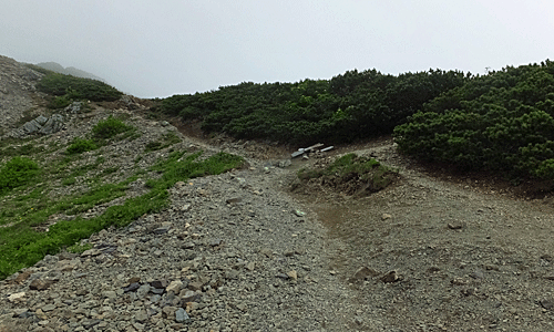 | 草すべりの草原が終わると、 潅木地帯になって展望が無くなり、 花もパタリと無くなった 代わりに、急な「岩すべり」が現れてきた 「草すべり」のネーミングは不適当 草があり、花があったのは、 二俣からの合流点までの約半分 |