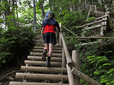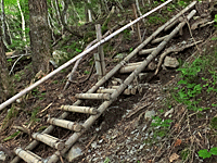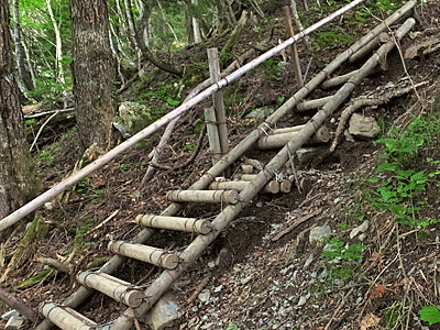 | 梯子階段、7つ目 8:19 外人さんファミリー3名 広河原山荘の宿泊者 大きなザック2つを、3人で交代して担いでいた |