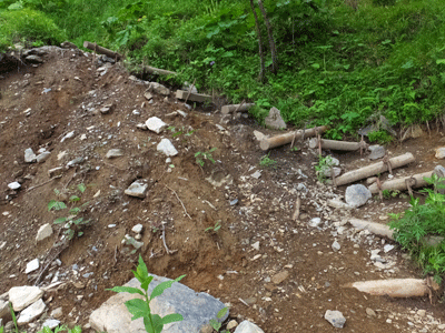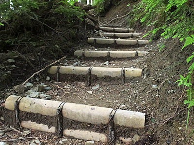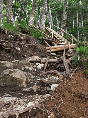 | ↑ 大雨があると、こんなふうに土が流れる 登山道整備も大変・・・ |