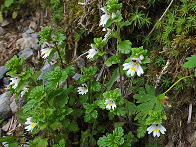 | コゴメグサの仲間:ハマウツボ科 ミヤマコゴメグサ・コバノコゴメグサなど、 そっくりさんがいて見分けが難しい 草すべりの草のある斜面に、 わんさか咲いていた |