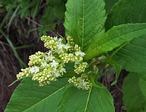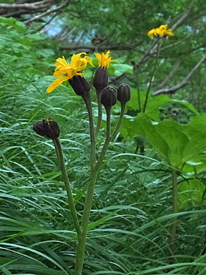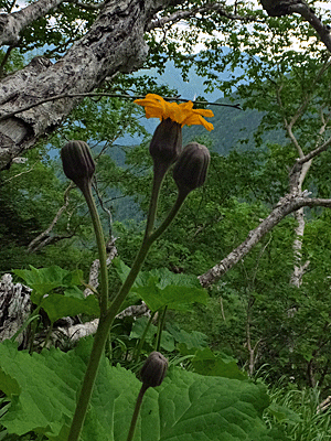 | マルバダケブキ:キク科 大きな葉っぱが特徴 ここより下の方では、葉っぱだけだったが ここへ来て初めて咲いて」いる花に出会った |