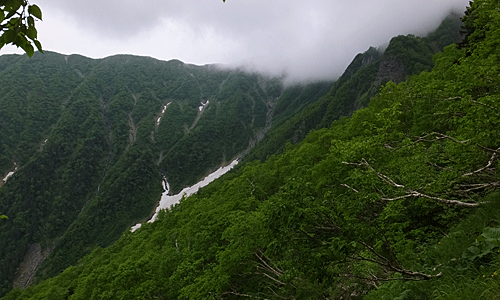 | 大樺沢の雪渓が見えてきた |
