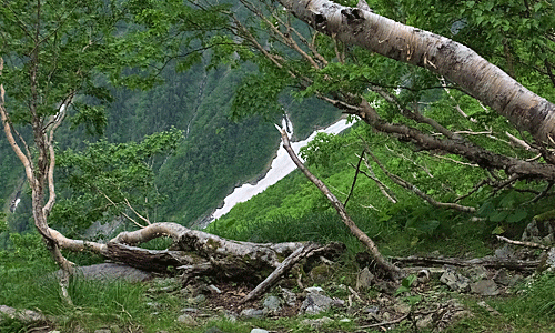 | 雪の重みで、 横倒しのようになっているダケカンバ その後ろに雪渓 |