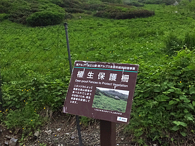 | シカの食害から防ぐための柵設置 12:43 ネットがぐるりと張り巡らされていた ここからは日当たりがよくなり、草原の花が現れた |