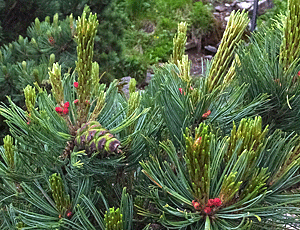 | マツの仲間:マツ科-1 左 ↑このマツ、下の方にある花はうす茶色・・・雄花 右 天辺に赤い花・・・これが雌花 |