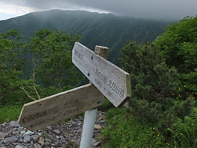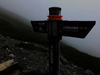 | 地面に置いてあった古い標識 13:26 ここから小太郎山へ行ける 予想通り風が強くなり、 ガスも出てきて視界が悪くなった |