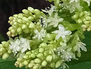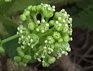 | ハリブキ:ウコギ科 茎にも葉にも鋭いトゲあり 右 花が咲き始めていた なかなか可愛い |