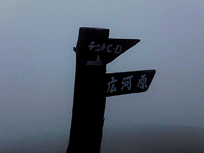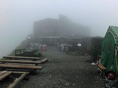 | 雨やガスの後でも、 急に晴れてくることがあるので、 たびたび外へ出て辺りを見渡したが 雨・風・ガスのまま ここのA・Bテント場はまだましな方 |