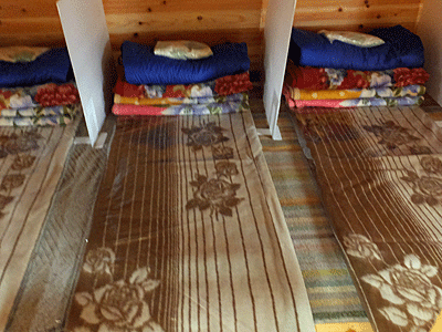 | 一部、パーテーションで仕切られていた ビニールで覆われた敷布団・毛布3枚・寝袋1・枕1 シーツは持参することになっている 24名のスペースがある部屋で 1人だけかと思っていたら、 あとから、単独の女性が2名入ってきて、 一つおきのスペースが割り振られた |
