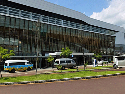 | 飯山駅 11:15着 立派な駅~ 新幹線が通るからだって 「北陸新幹線:飯山駅」 1階が在来線ホーム 2階が新幹線と在来線の改札口 3階が新幹線ホーム 改札で590円払って出た 外には、ペンションのお迎えの車 女性だった 外は暑~い! 山の方へどんどん走って 「班尾高原」へ スキー場が見えた!かなりの急坂 「あそこを登ります」・・・と言われ、ぎょっ! |