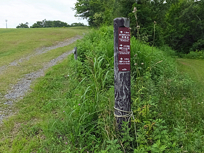 | 山頂のすぐそばに「大明神岳」の案内 ここから0.4kmだって 尾根は、まっ直ぐと右折に分かれていた 右折して、軽いアップダウンの後、 |