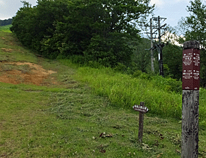 | 左 まだまだ緩い斜面の序の口 右 「斑尾山登山道:かえでの木トレイル」の文字 12:00 日陰もない斜面を、我慢の一字で歩く |