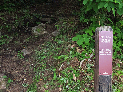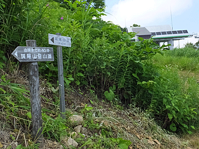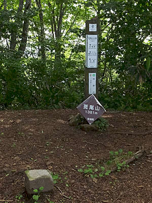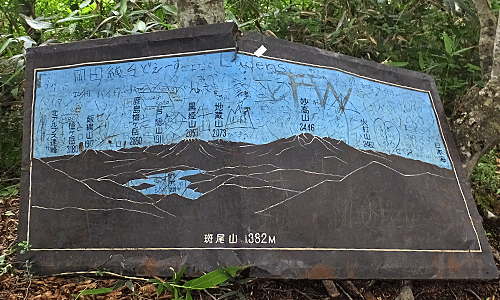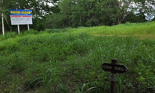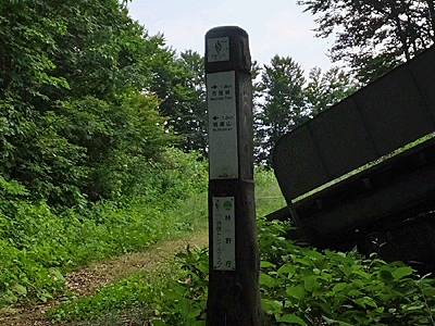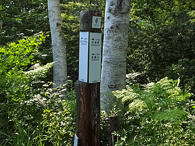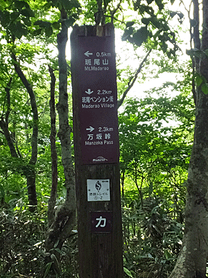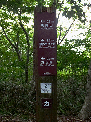 | ここが分岐点 ↑ 古びたトタンに山の名前が書いてあった 左へ行けば、斑尾山 右へ行けば、万様峠 木陰で涼しい~ 万坂峠方面から男性1人が登ってきた どこから?と尋ねると、「高山市」!からだって 同じ岐阜県じゃないのお~ 車で来て、自転車も積んで、車中泊して歩くとか |