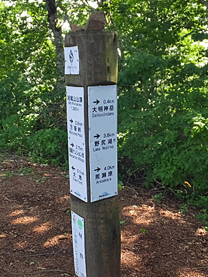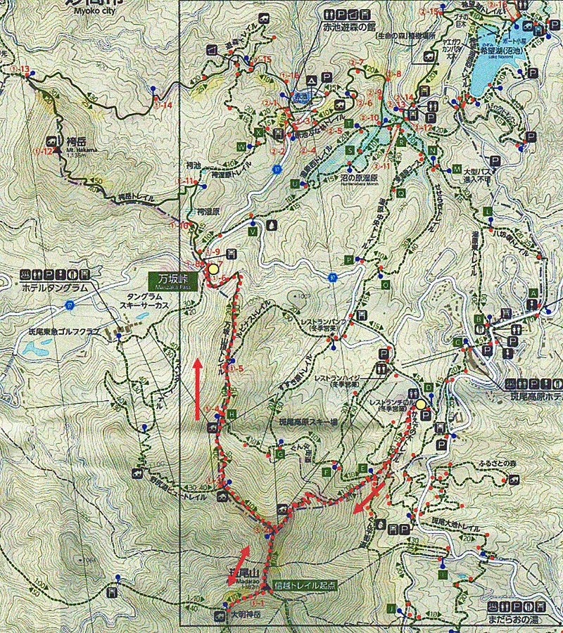 ![]() ↑ 登山口 ![]() ↑ 斑尾山山頂 ![]() ↑ 大明神岳から野尻湖を望む ![]() ↑ 万坂峠 |