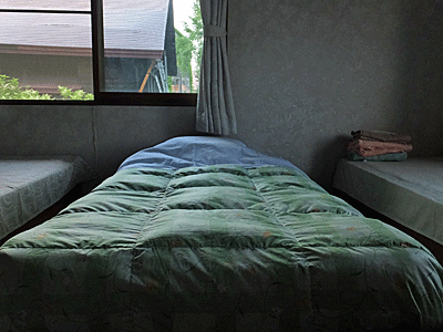 | 汗びっしょりでペンションに着いた 玄関まで行く階段がしんどかった・・・ お客は私1人 3人部屋でベッドが3つ (この部屋の上にロフトもあった) エアコンなし・扇風機が1つ お風呂に入って、夕食は18時から |