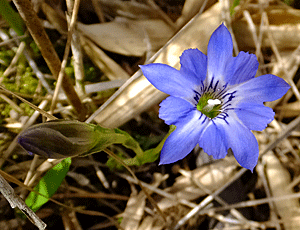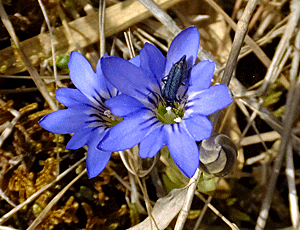 | ハルリンドウ:リンドウ科 竜吟湖の傍の湿地に まだ咲いていた 上右 つぼみのようなものは、 つぼみではなく花が終わった状態 下 こんなピンク色は珍しい |