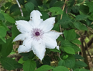 | クレマチス(テッセン):キンポウゲ科 庭の花がなぜこんな所に? 鳥が種を運んだのかも・・・ |