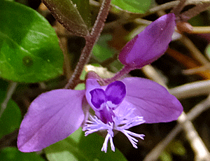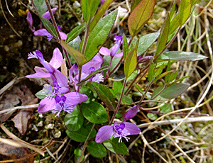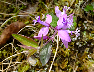 | ヒメハギ:ヒメハギ科 木陰で1回目の昼食休憩した近くに咲いていた 両側に大きく開いている部分は、萼 花びらは、ネズミの耳状の部分と (ネズミの顔に見えるよね) 髭状のぴらぴらしたものが付いている部分 |