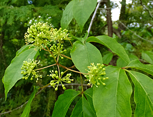 | タカノツメ:ウコギ科 ついこの前、 山菜として摘み取っていた若葉が もう、こんな固い葉っぱになり 花が咲いていた 雌雄異株なので これは雌株 |