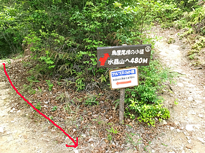 | 合流点 今日は赤い矢印で降りてきた 登りには使いたくない道 |