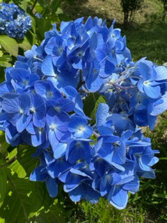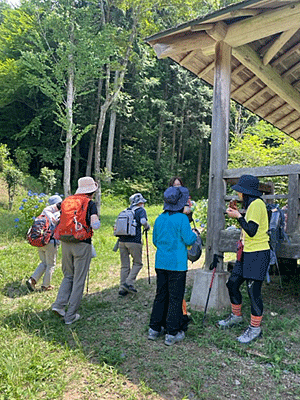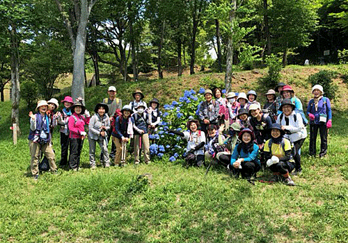 | Lの休憩舎の前、アジサイをバックに 集合写真 |