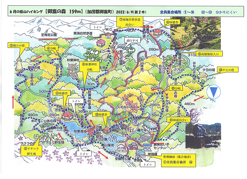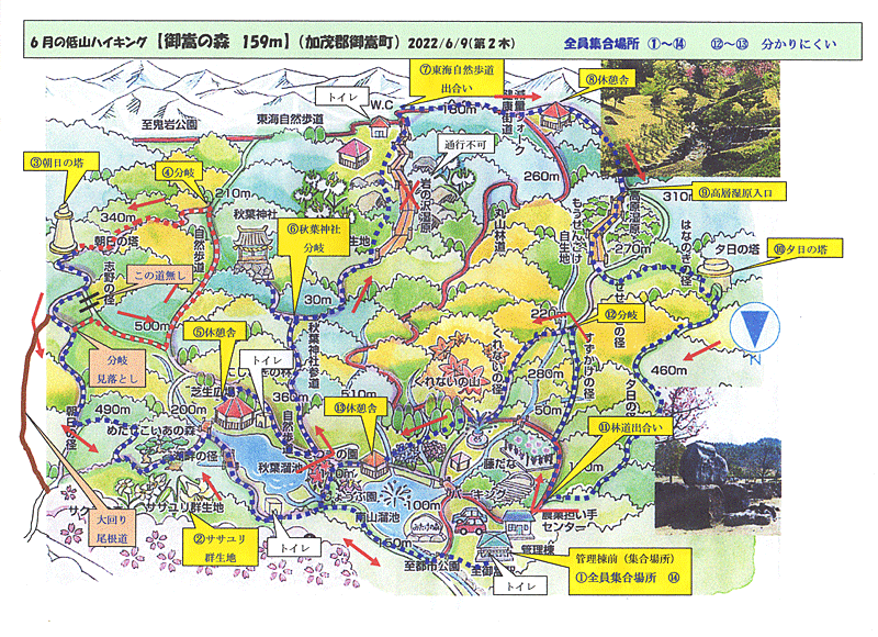 | *今日はカメラを忘れてしまい、スマホで撮った。 日頃使い慣れていないので、きれいに写らず、細かいピントが合わせにくいことといったら! 不覚! *そこで、2人の助っ人にお願いし撮ってもらった。 21人という大人数だったので、かえって良かったかも。 後日、画像とコメントを送ってもらい、『3人合作』となった。 *管理棟のトイレはとてもきれいだった! *他のトイレは、ボットントイレ。 *標識が無い分岐もあって、まごついた。 ・・・・・・・・・・・・・・・・・・・・・・・・・・ ◎朝日の塔へ登る分岐(標識が無かった)を見落としたため、コースを変更した。 帰ってから、地図を数枚比べた所、大回りの尾根道コースが描いてないことと、 実際にはないコースが描いてあったため混乱した・・・と思った。 〇実際に歩いたコース(間違えた部分は赤点線)に、大周りの尾根道コースを付けたし、 実際にはないコースを「この道無し」と注意書きした地図を作ったのが こちら |