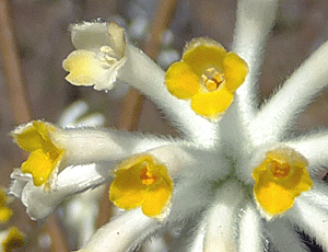 | ミツマタ:ジンチョウゲ科 この前(3/5)はまだ白い状態だったが、今日は黄色の花が咲いていた 『萼は筒状で、先は4裂し、内側は黄色、外側は白く毛が密生する』だって 正面から見ると、ふわふわの柔らかい毛に包まれた中から、黄色い花がパッと開いてくるのはとても可愛い!! 『花には花弁がなく、花弁のように見えるのは萼片』なんだって 『8本の雄しべ、1本の雌しべ』があるそうだが、どう見ても8本はない・・・と思って図鑑で調べた所 8本のうち、『長いのが4本、短いのが4本』だそうだ へ〜え 『わずかに甘い香りがする』そうだが、気づかなかった・・・ |