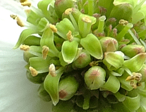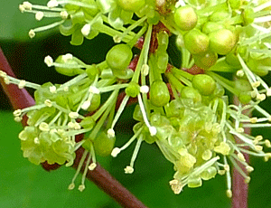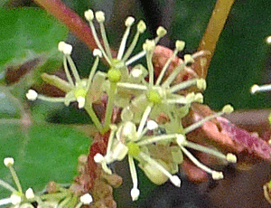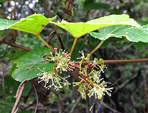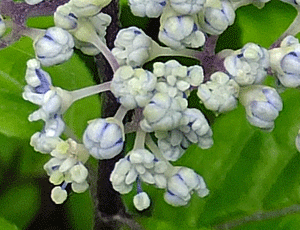 | サンカクヅル(別名行者の水):ブドウ科 『雌雄異株』 『黄緑色の小さな花をつける。花弁は5個、先がゆるく癒合し、開花と同時に帽子が取れるように落ちる。 雄しべ5個、花糸は糸状。雌しべ1個。果実は直径6〜10oの球形の液果。黒く熟すと、甘くて美味。』だって では、これらの画像は、どっち? 雄しべがつんつんと伸びているので、雄花(雄株)だろう 別名は、『修験行者が茎の切り口から出る甘い水で喉を潤したことからといわれている。』・・・と へ〜え、そうなんだ! |