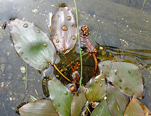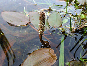| ヒルムシロ:ヒルムシロ科 「大洞のため池」に、突き出ている棒のようなものがあった これが花らしい 『先端に根棒状の穂状花序をつける。花は両性花で柄がなく、やや密につく。 花には花弁も萼もない。花後、花茎は倒れ込んで、果実は水中で熟す。』・・・と へ〜え、そうなんだ・・・ 1 突き出ている棒のような花穂 2 倒れてしまった様子 3 花穂の拡大 |