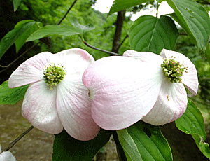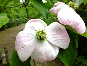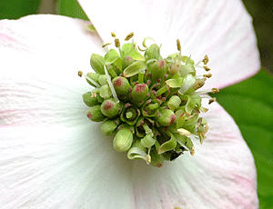 | ヤマボウシ:ミズキ科 園芸種だろうか、総苞(花びらのように見える部分)がピンクがかっていて、大きい 中央にあるのが、花(集合花) 『総苞片がくたびれてきたころ、中心の集合花が開花する。花弁、雄しべが4つずつ、雌しべが中央に1つある。』・・・と |
