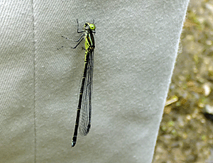 | イトトンボかな? 前を歩く人のズボンにくっついていた 払うくらいでは逃げず、引き剥がすようにして取り去った |