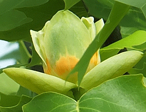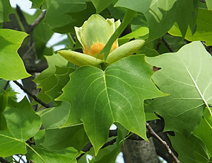 | ユリノキ:モクレン科 高い木の大きな葉っぱの間に、数個の花が咲いていた 成長がとても早いとか 街路樹にも植えられているが、花は見たことがない(電線に引っかかりそうで街路樹には不向き) 大きい葉っぱは、秋、掃除が大変!で悩みの種になる |