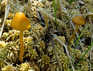 | キノコの仲間 ヒメコガサの仲間かな? 湿地のミズゴケの中から生えていた 背丈5〜6cm |