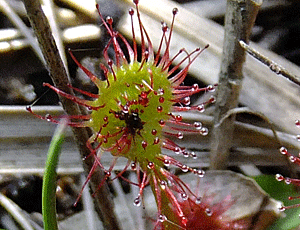 | モウセンゴケモウセンゴケ科-1 湿地は、この1週間ほど雨が降っていないせいか、水が減っていた しかし、雨靴で踏むと、その足型の所がじわあ〜っと湿ってきた ロープを張った区間の中、 モウセンゴケ以外の笹や、カヤツリグサ科の葉などを刈り取ったらどうなるか・・・を試してみる作業を行った ロープの外にも、たくさんモウセンゴケがあった |