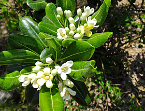 | トベラ:トベラ科 咲いたばかりは白色 その後黄色になっていく 『雌雄異株』なので、これは雌株(雌しべが見える) |