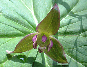 | ミヤマエンレイソウ・深山延齢草 (別名シロバナエンレイソウ・白花延齢草):ユリ科 大きな葉3枚の真ん中に白い花 『3枚の外花被片と3枚の白い花弁状の内花被片、6本の雄しべをもつ花を生じる』・・・と つまり、緑っぽくとがっている部分が、「外花被片(がいかひへん)=萼」 白い大き目の部分が、「内花被片=花びら」 |