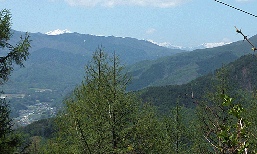 | 鉄塔の近く、木が伐りはらわれた所から中央アルプスを展望 頭がちょっぴり見えるだけ |