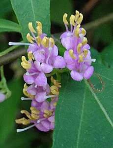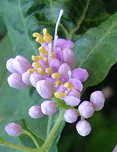 | ムラサキシキブ:シソ科 昨日の「御嵩の森」では、ぜ〜んぶつぼみだったが、ここではかなり咲いていた 雌しべ(白くにゅっと突き出ている部分)の長いこと! |
