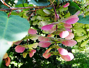 | ウリカエデ:ムクロジ科 翼果が色づいてきた 白い翼果もまだたくさんぶら下がっていた |