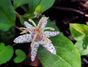 | ヤマジノホトトギス:ユリ科 花びら(大3枚・細3枚)の模様が、野鳥のホトトギスの胸の斑点に似ていることから名付けられたとか 中央からにゅっと突き出て、斑点があるのは雌しべ(3本) 斑点がなくて白いのは雄しべ(6本)。 みな背が低かった 10cmあるかないか |