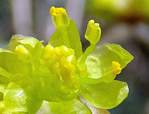 | ショウジョウバカマ:ユリ科-2 上左 花びら6枚 雄しべ6本 根元が膨らんだ雌しべ1本 これで1つの花 こんな花が茎の天辺に集まって咲く 総状花序(そうじょうかじょ) 上右 雄しべの葯は紫色 花粉が出始めると、白っぽくなる 下 にゅっと突き出ているのは雌しべ 雄しべはまだ短い 雌しべ先熟 |