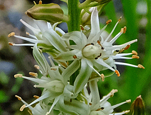 | ノギラン:キンコウカ科 下から順に咲き上がっていく 咲いたばかりの雄しべの葯はオレンジ色 |