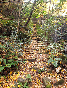 | 落ち葉いっぱいの階段 シロモジの葉っぱが多い |